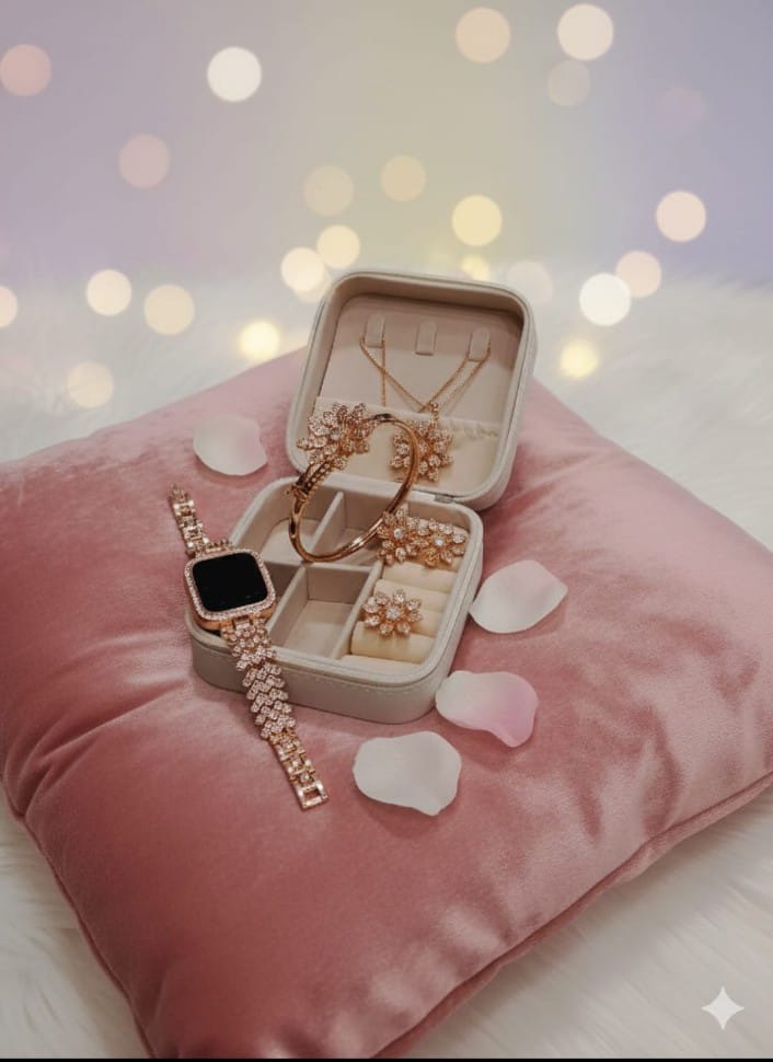 This elegant jewelry set includes a stunning mix of pieces that exude luxury and sophistication. The collection features a beautifully crafted rose gold watch with intricate diamond-like detailing, perfect for adding a touch of glamour to any outfit. Alongside the watch, the set also includes a delicate bracelet, a pair of flower-shaped earrings, and rings with similar floral designs, all showcasing intricate craftsmanship and sparkling stones. Presented in a stylish jewelry box, this set is ideal for special occasions or as a thoughtful gift.